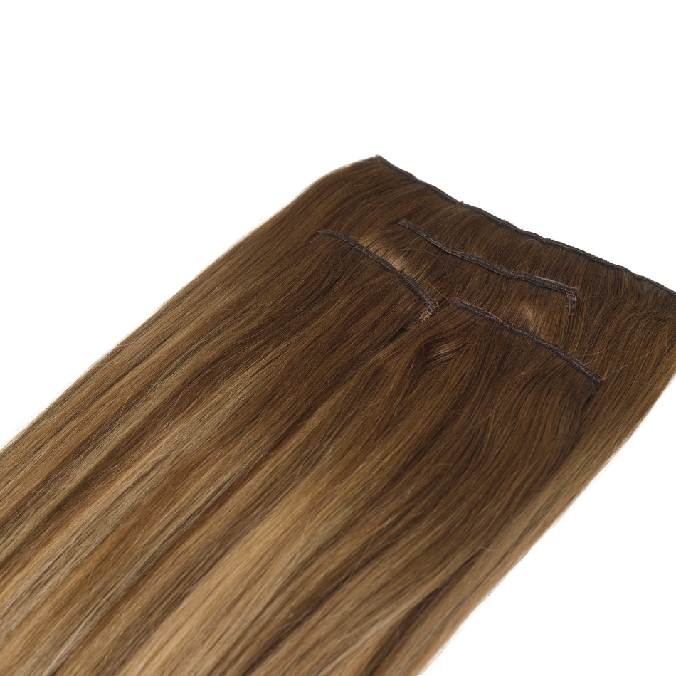 Extensión color castaño con mechas miel